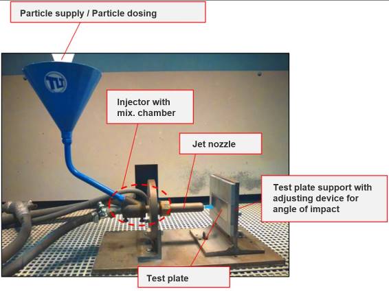 Already since approx. 1970, TLT-Turbo has performed particle jet wear experiments on various fan materials and coatings. For that, TLT-Turbo used a particle jet test stand, where a standardized test sand (with standardized grain size distribution) was blasted under a defined pressure / speed as well as special defined angles to surfaces of different fan materials and coatings. By exactly measuring the material loss after a defined amount of sand / time of blasting, TLT-Turbo determined erosion rates that correspond with the wear resistance of the investigated materials and coating. Figure 2 shows the old test stand.