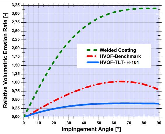 The inferior erosion rate of a welded coating (especially at steep angles like 50-90°) only partly can be compensated by higher coating thickness. A typical welded coating thickness lies at 3-4mm, an HVOF coating often at 0.5mm.