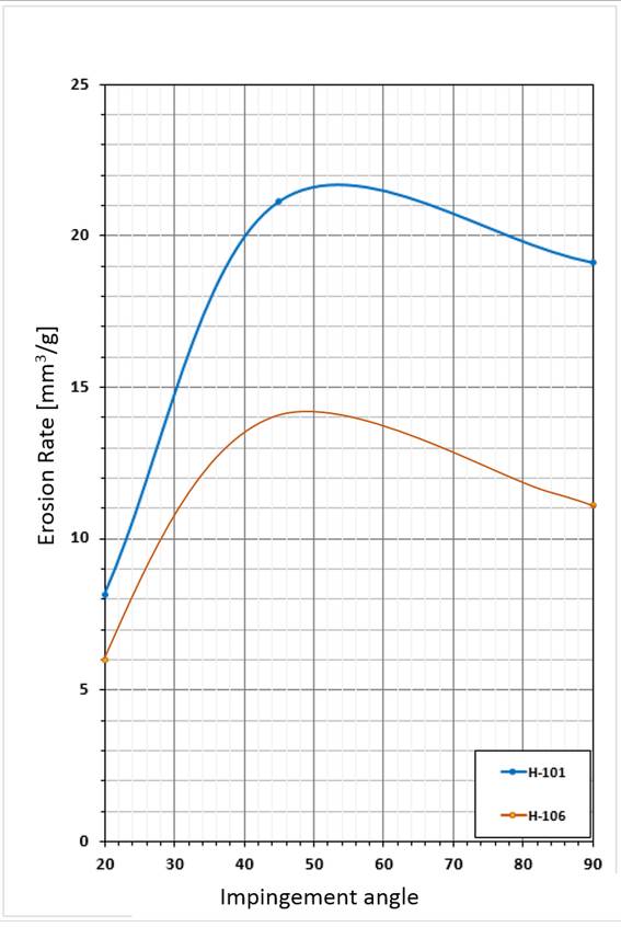 Another disadvantage of centrifugal fans with hardfacing is the rough surface. This coarseness causes aerodynamic disturbances and has a negative impact on the efficiency of centrifugal fans in steel industry. Furthermore, the risk of caking (adhesion of dust particles on the surface) on blades or hardfaced areas rises. Figure 3 shows an example of a typical surface of a welded coating. Compared to sophisticated thin layer coatings a welded coating furthermore has a higher erosion rate. Figure 4 compares a typical erosion rate of a welded coating (green) with a typical thin layer coating (red) and TLT-Turbo’s H-101.