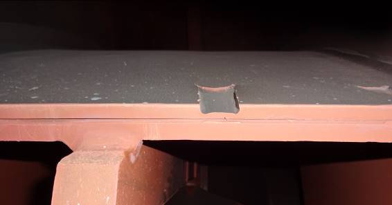 However, HVOF coatings also have a few disadvantages. The main disadvantage is the price per square meter which is higher than a typical price of a common hardfacing. In CAPEX oriented markets that often prevents the choice of a HVOF coating. Another disadvantage of HVOF coatings is that their robustness (e.g. against major mechanical impacts like a blow of a hammer) can´t compete with hardfacing yet. That means it is advisable to handle a HVOF coating with more care than a welded coating. Else you risk a crack in the coating which is a starting point for further chipping and expose uncoated surfaces to abrasive dust. Figure 7 shows the result of a crack in the coating between a welded-in countersunk head screw and a wear blade.