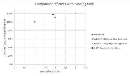 A further advantage of the solution is the comparatively cheap price for the blade with only slightly higher costs than a pure welded coating. This of course presumes that not the entire blade gets the hybrid coating, only those areas that are most prone for wear. Depending on the increase of operating time required by the steel plant, typical costs for a wear protected impeller are shown in Figure 9.